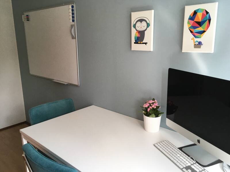 De werktafel en het grote whiteboard zijn prettig om aan te werken.
